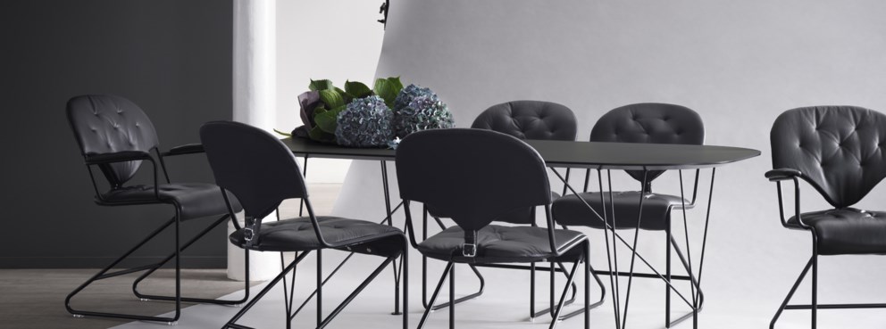طاولة طعام بيضاوية تشجع على تبادل الحديث والتواصل البصري مع جميع الضيوف. تتوفر الطاولة كذلك بإصدارين آخرين، طاولة طعام بسطحين قابلين للتمديد، ونسخة أصغر حجمًا للمقاهي.